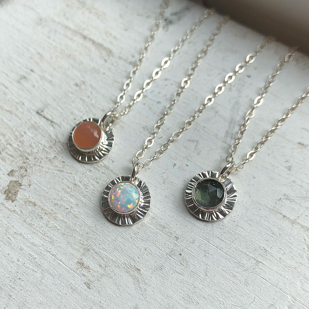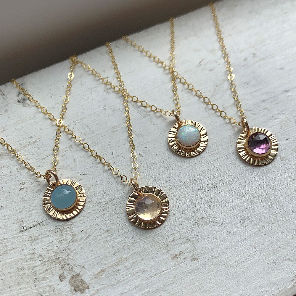 The glow of good energy from our Aura birthstone necklaces is matched only by their sparkle. Hand textured warm metals pair with high-grade gems to create a gorgeous necklace perfect for wearing on its own, or as part of your fave necklace stack.