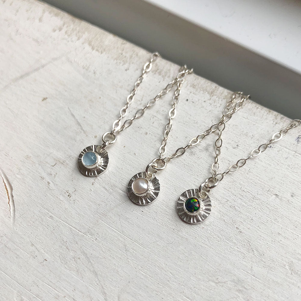 The glow of good energy from our Aura birthstone necklaces is matched only by their sparkle. Hand textured metals pair with high-grade gems to create a gorgeous necklace perfect for wearing on its own, or as part of your fave necklace stack.