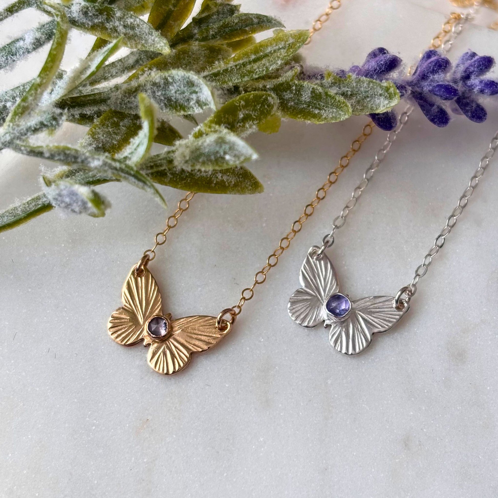 Handcrafted with intricate textured butterfly details and a glowing rose-cut tanzanite gemstone, our butterfly necklace embodies the elegance of a butterfly in flight, capturing the essence of transformation and freedom.