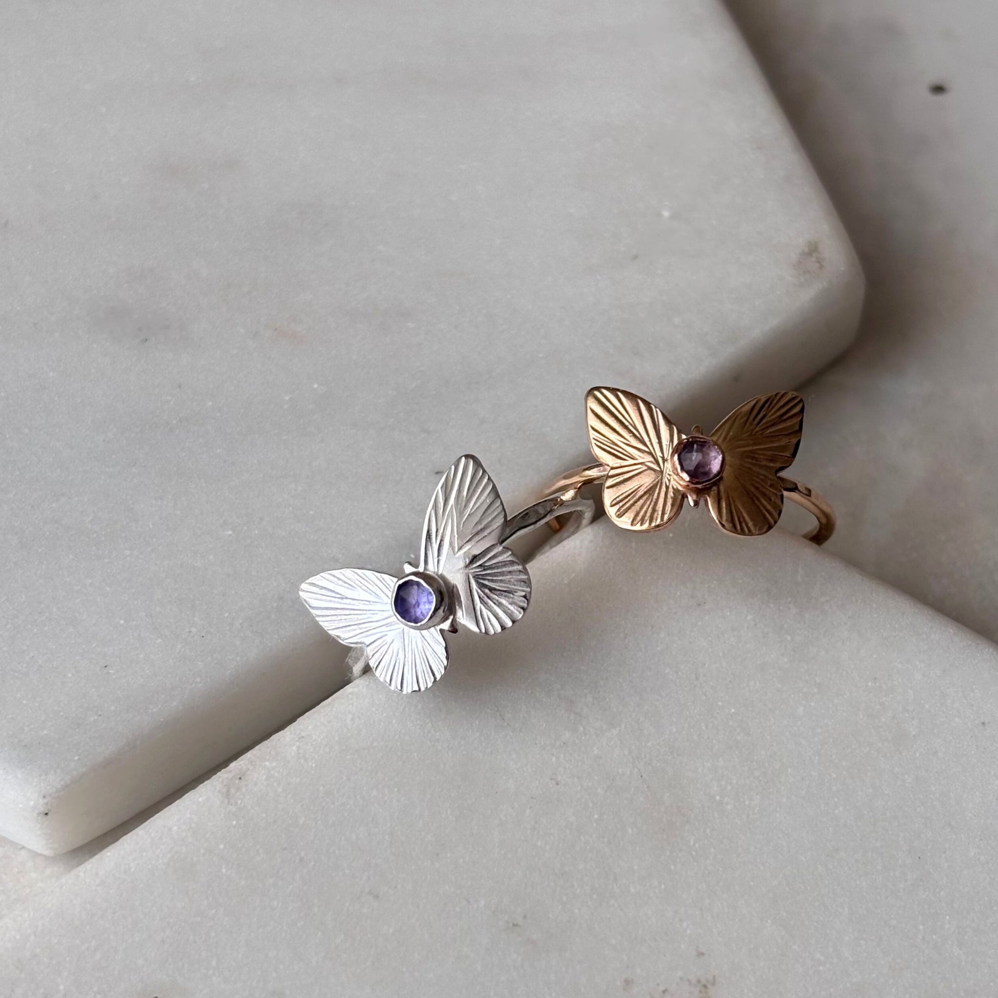 Handcrafted with intricate textured butterfly details and a glowing rose-cut tanzanite gemstone, our butterfly ring embodies the elegance of a butterfly in flight, capturing the essence of transformation and freedom.
