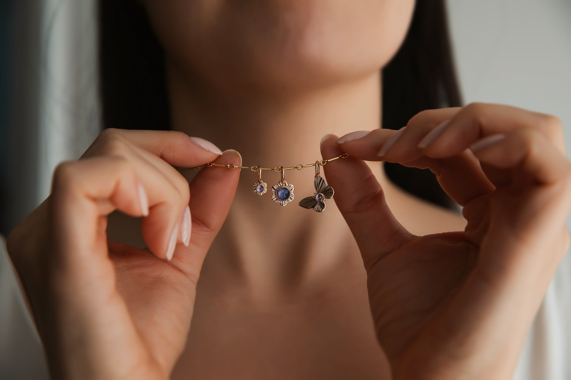 Handcrafted with intricate floral details and a glowing rose-cut tanzanite gemstone, our flower charms embody the beauty of a flower in full bloom, capturing your unique life force with every delicate petal.