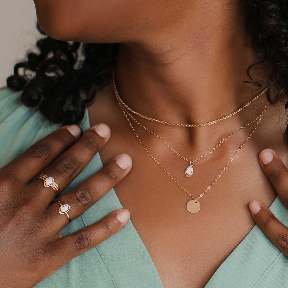 Our heritage opal necklace is a modern mix of fresh materials and vintage shapes. Warm hand-textured metal melds perfectly with old-world opal, creating a timeless pendant you can effortlessly layer with anything in your jewelry box.