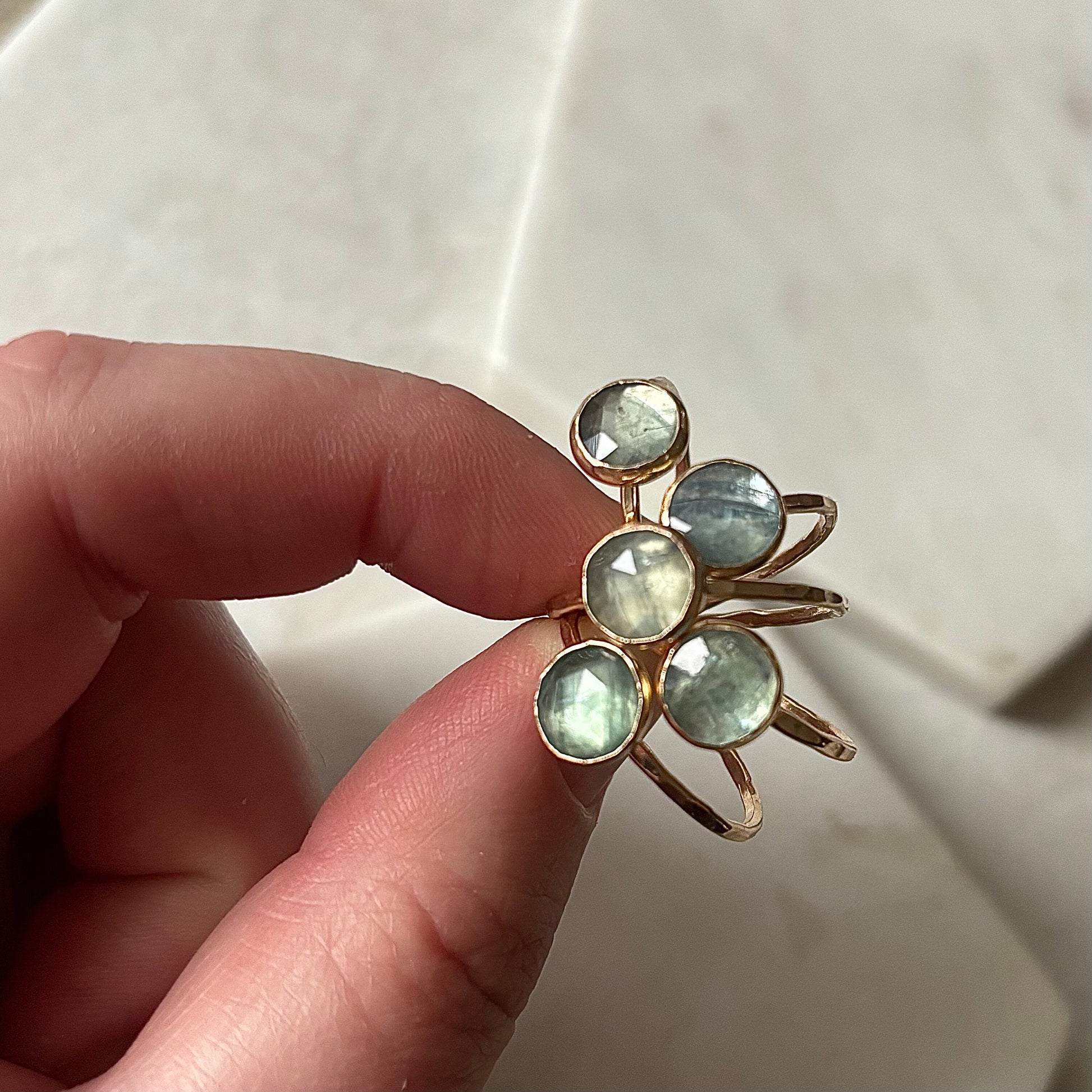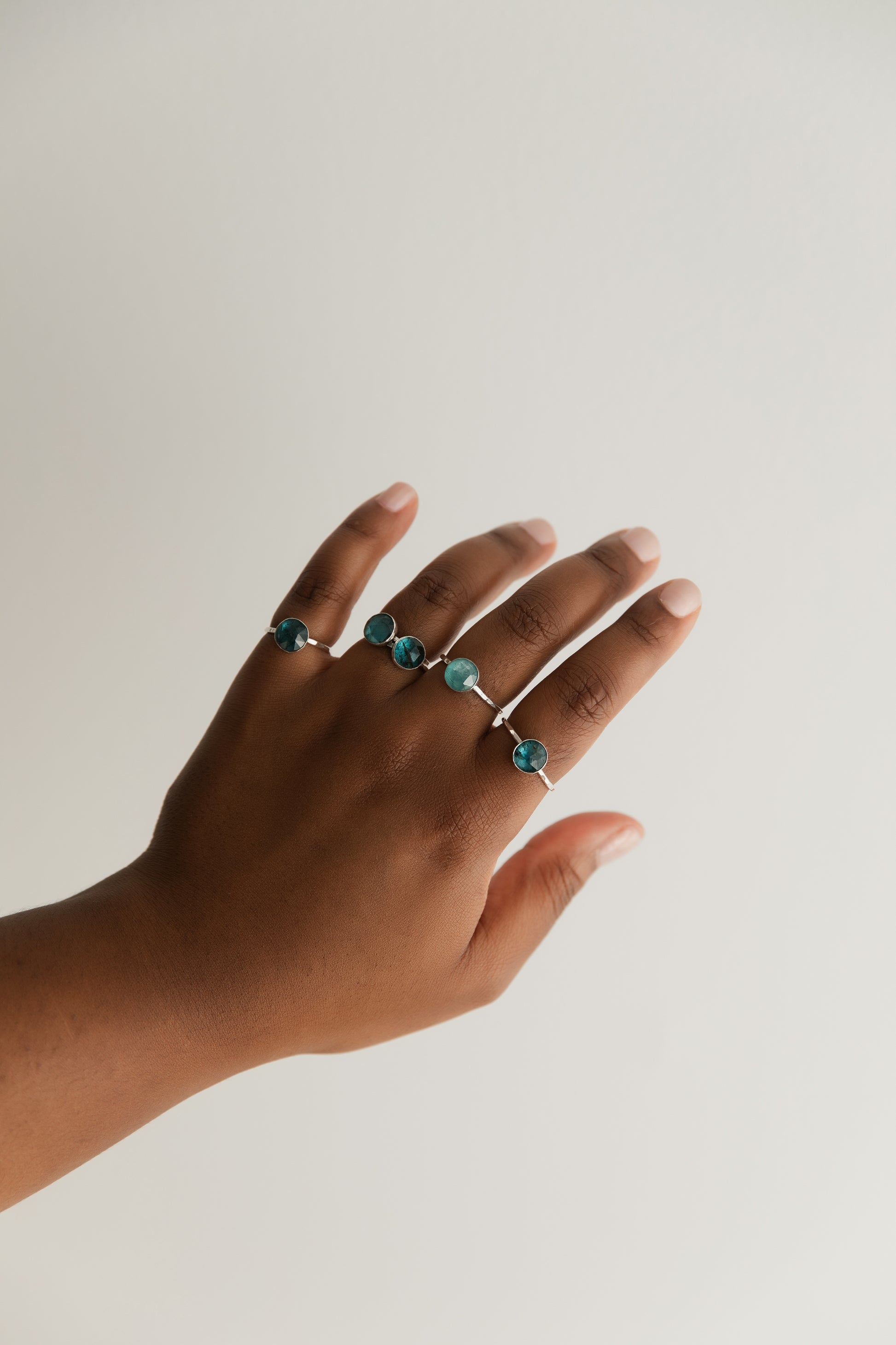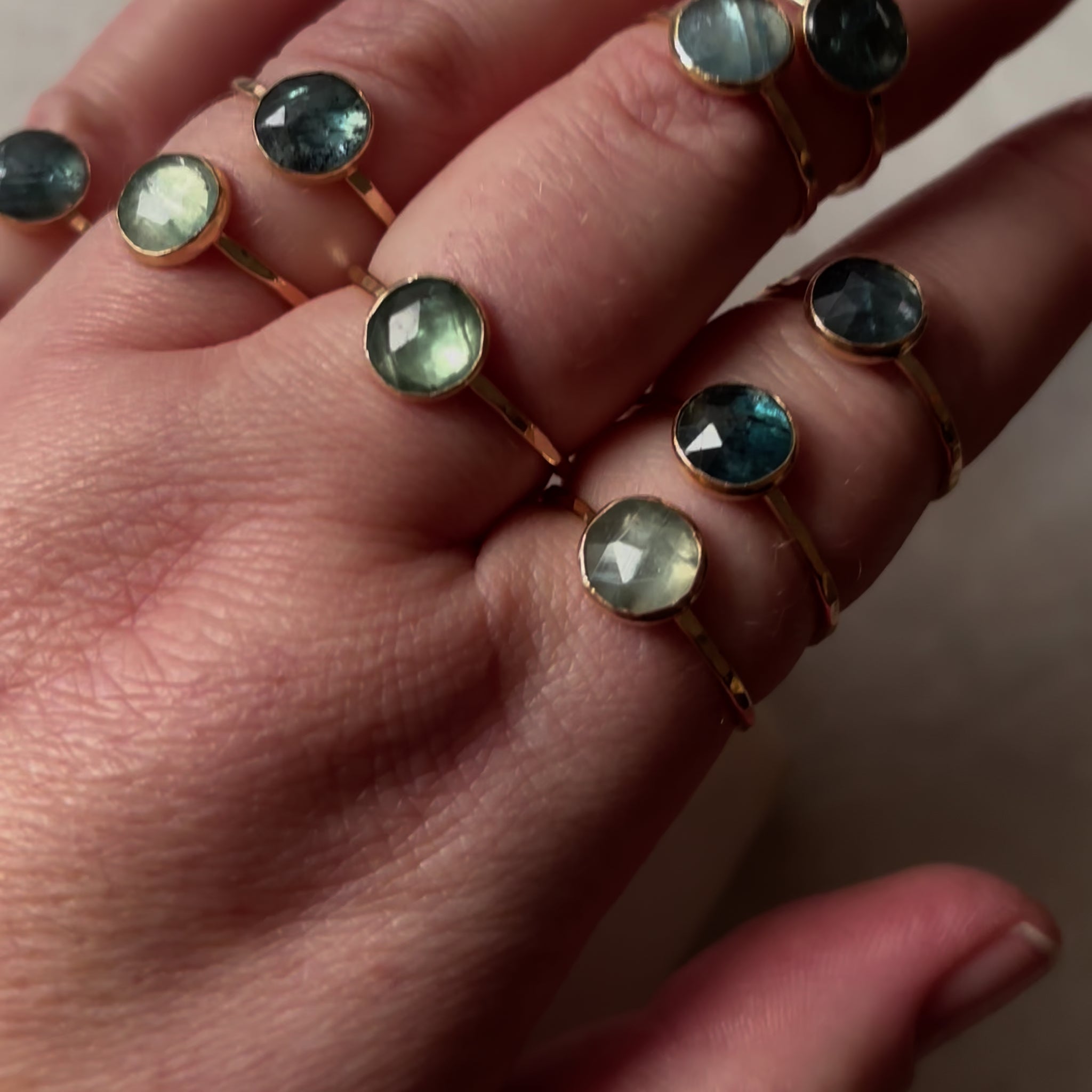 Our kyanite stacking ring is a mermaid's dream. This gemstone ranges from light aqua to deep dark teal, and we love it in all it's gorgeous shades. Expert faceting makes this kyanite sparkle like crazy, and we bet you won't be able to stop staring at it on your hand!