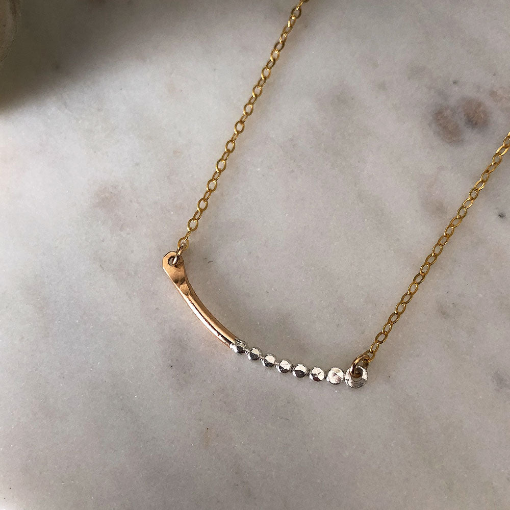 This mixed-metal Prism Bar necklace is a minimalist dream. Eye-catching textured silver orbs contrast with smooth 14k gold-fill to create a trompe-l'oeil dupe for pave diamonds; sparkle on, beauty!