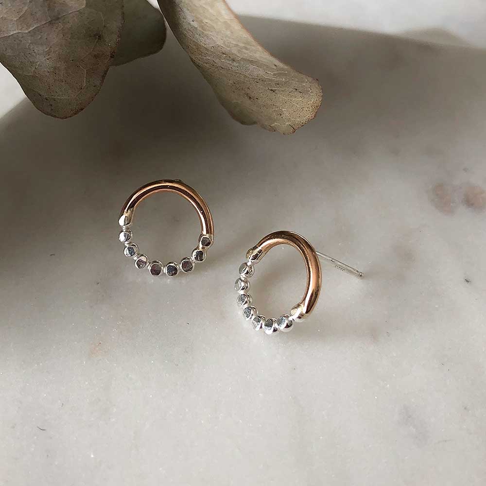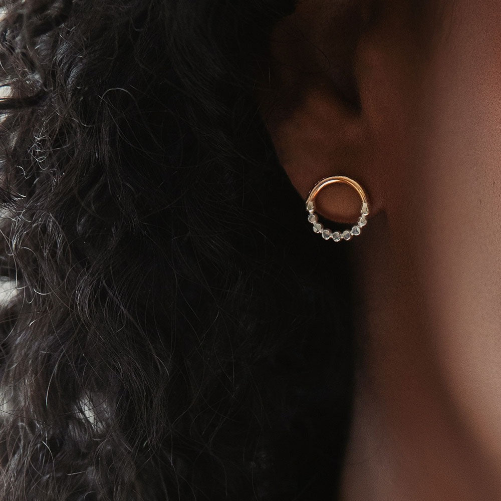 Our mixed-metal Prism Circle Stud earrings are reflective delight. Hand-textured orbs in sterling silver give the illusion of pave diamonds, and cast light in all directions.