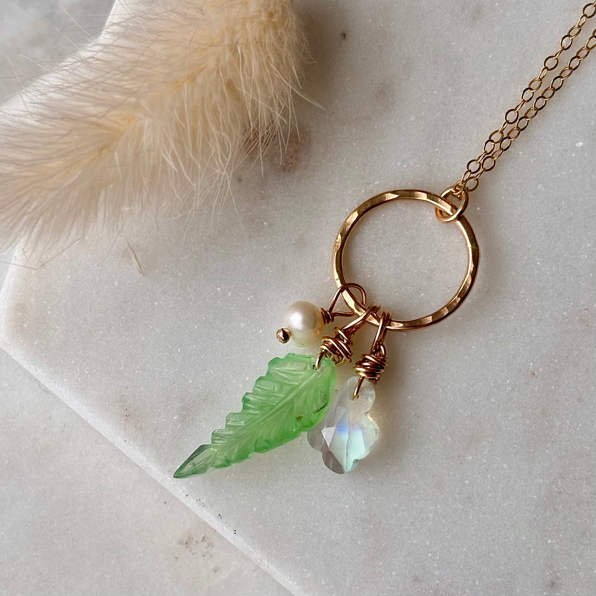 A one of a kind necklace featuring aventurine freshwater pearl and rainbow moonstone dangling from a hammered circle.