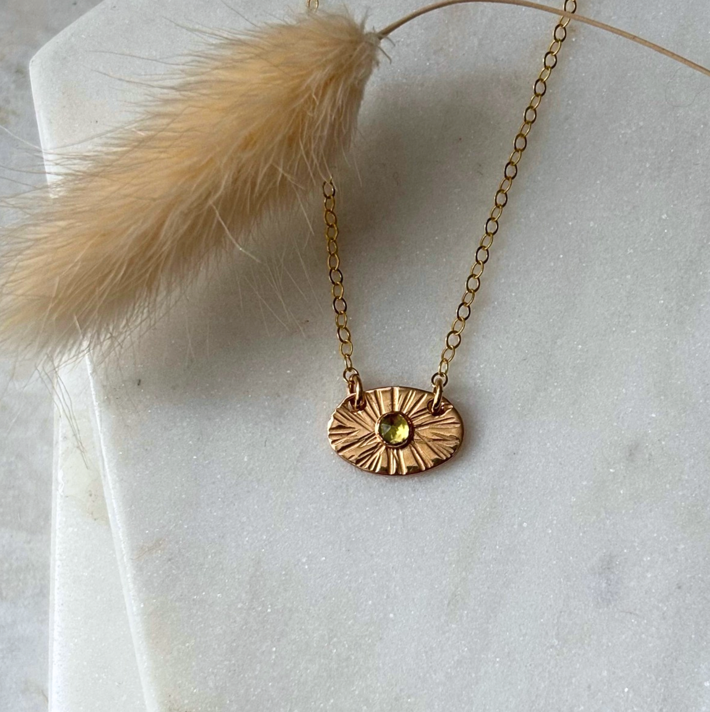 A one of a kind necklace featuring a bezel-set petite peridot paired with a textured oval pendant.