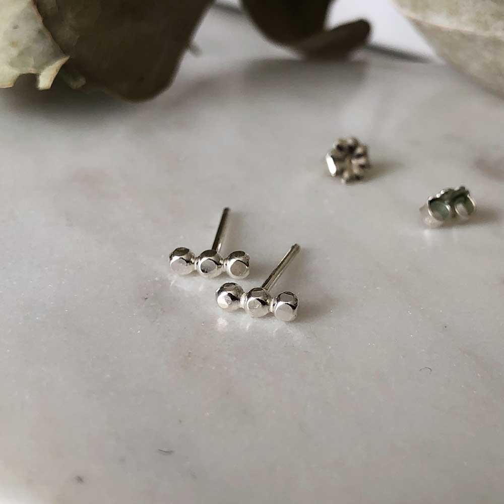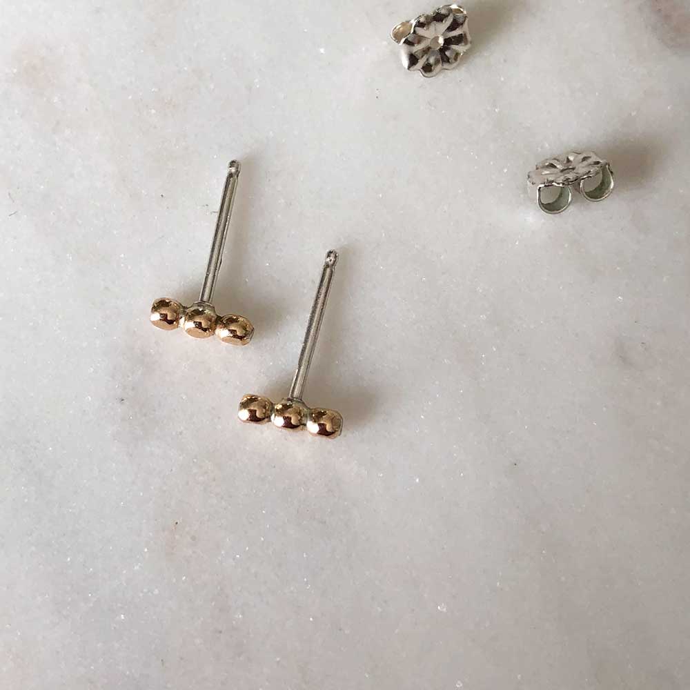 Our prism bar stud earrings are the sparkliest way to add texture and interest to your earring stack. Hand-finished orbs cast light in all directions. Equally at home in a main piercing or second/third piercing.