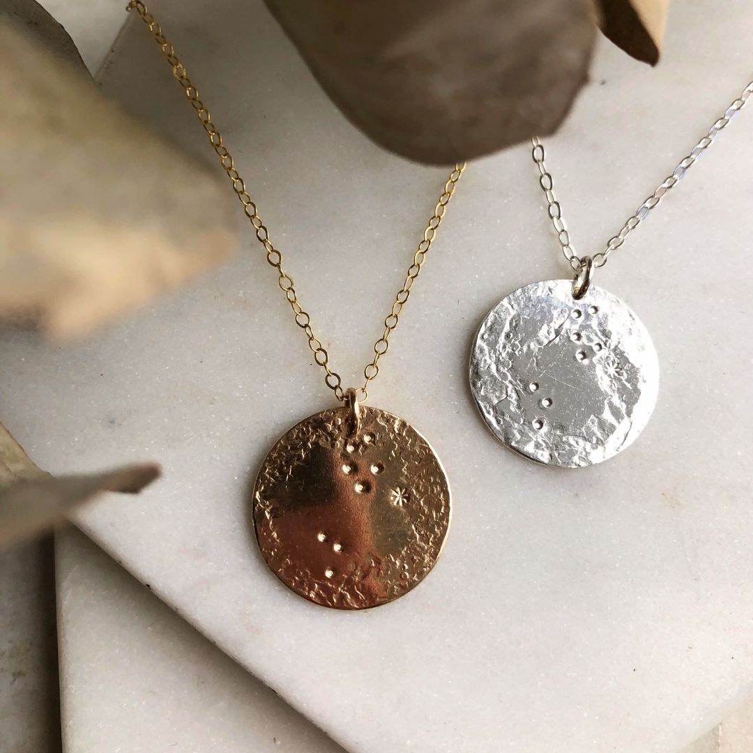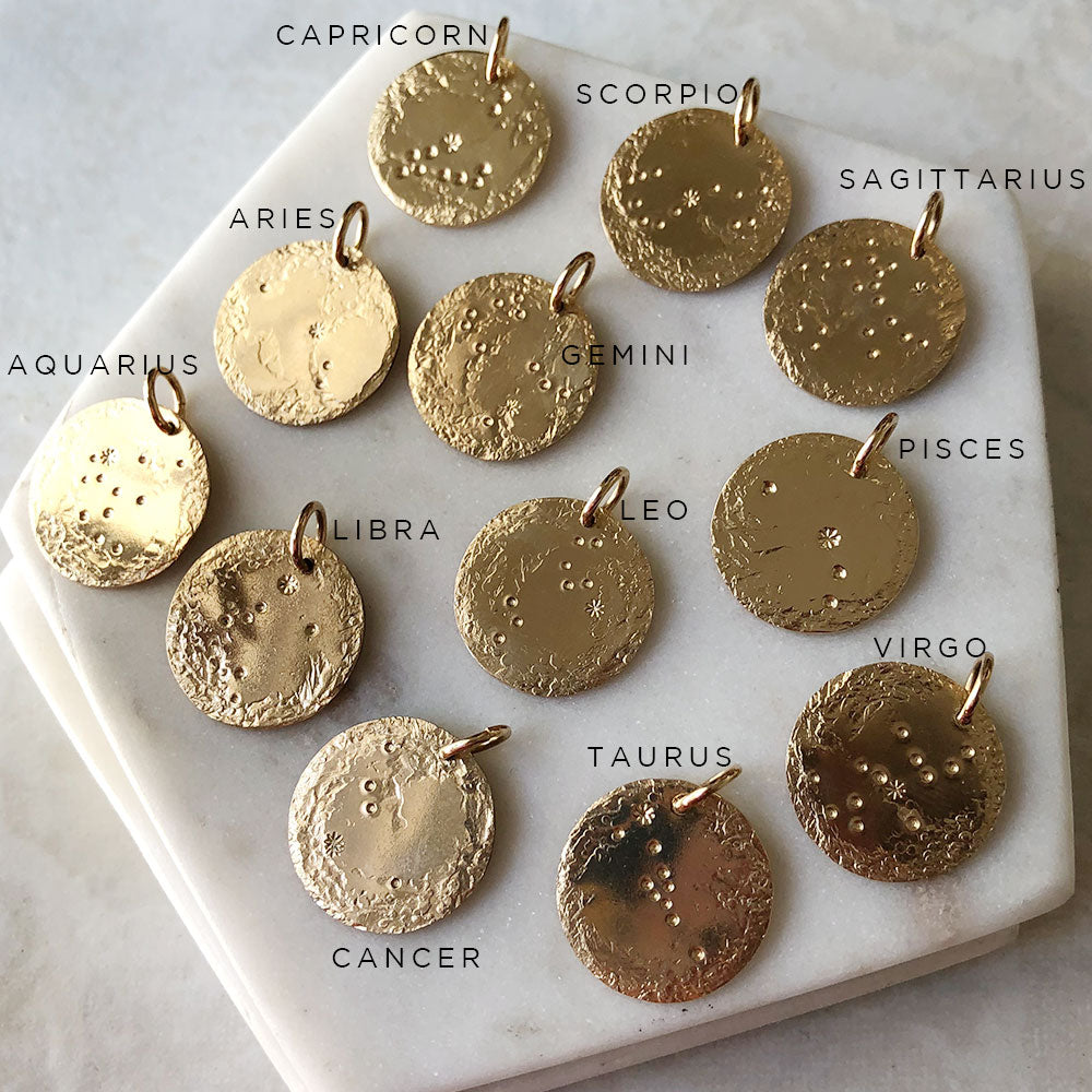 Adorn yourself with the celestial beauty of our 14k gold-fill zodiac pendant necklace. Each pendant is created one-by-one, based on the constellation pattern for your unique star sign. Uniquely hand-textured with our stardust texture and hand-stamped with stars, each one is completely one-of-a-kind. You'll feel starry-eyed in this ethereal handcrafted pendant, made just for you.